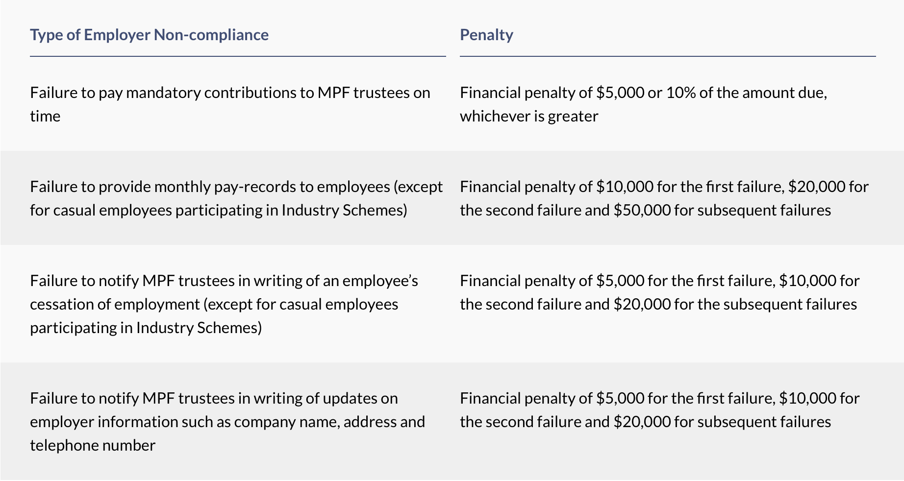 Employers who do not comply with MPFA’s regulations may be penalized financially, with penalties as follows: